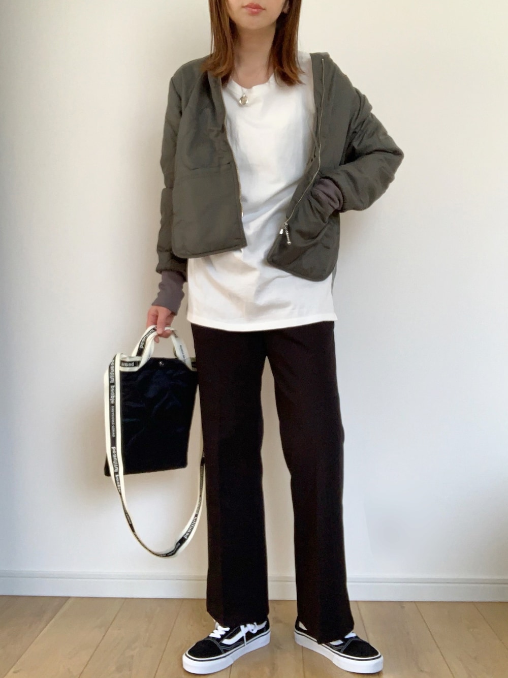 ショート丈のキルティングジャケットで辛口めなシンプルコーデ☺︎ 白Tはスリットパンツで大人っぽくしました。 見て下さりありがとうございます。