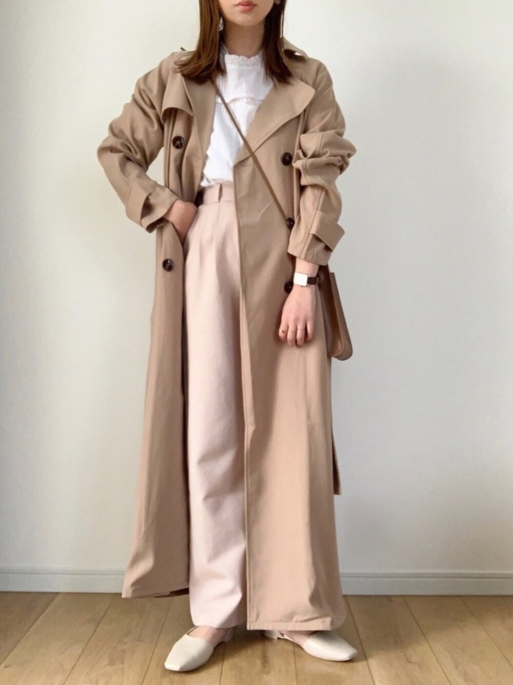 ゆるっとロングなトレンチにレースブラウスを合わせました☺︎ パンツも明るめのピンクベージュで春カラーコーデにしました。 見て下さりありがとうございます。