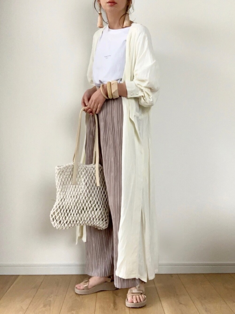 暖かくなったらしたいガウンコーデです☺︎ ちょっと夏を思わせる雰囲気のアイテムでまとめました。 存在感のあるタッセルピアスはCreamちゃんのブランドのBOEMYのものです。 大きいのに軽いので、つけやすいです。 見て下さりありがとうございます。