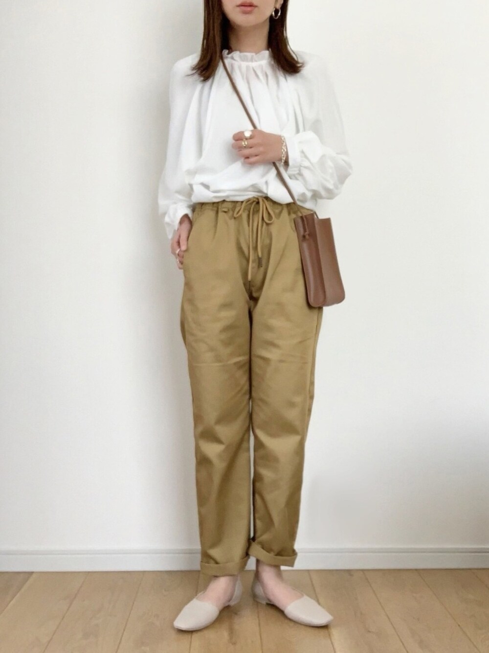 お気に入りのGUのブラウスにチノパンを合わせました☺︎ アクセサリーはシルバーの華奢なタイプでまとめました。 見て下さりありがとうございます。