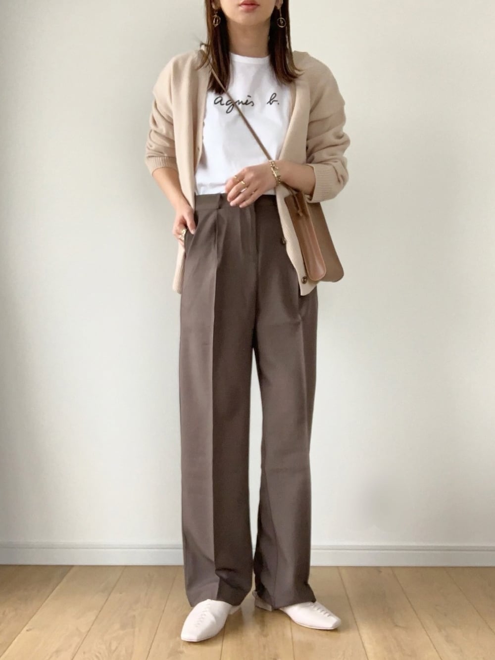 形がすごくキレイなスラックス。 Mサイズだと大きかったけど、それでもキレイ! 違う色でSも欲しいです☺︎ カーディガンとロゴTでシンプルに合わせました。 見て下さりありがとうございます。