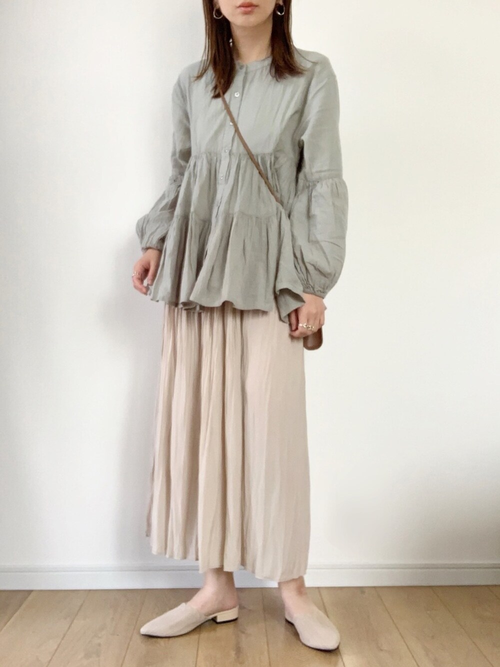 ぽわんとしたお袖に ティアードが可愛いブラウス☺︎ くすみミントがまた可愛い! UNIQLOの ワッシャーサテンスカートパンツを 合わせて、 大人ガーリーな感じにしました。 おうちファッションでも リラックスして過ごせそうです。 見て下さりありがとうございます。