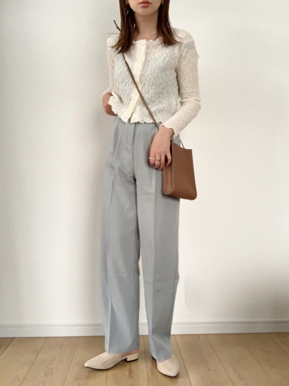 コンパクトで可愛いカーディガンに ミントのワイドパンツを合わせました☺︎ 見て下さりありがとうございます。