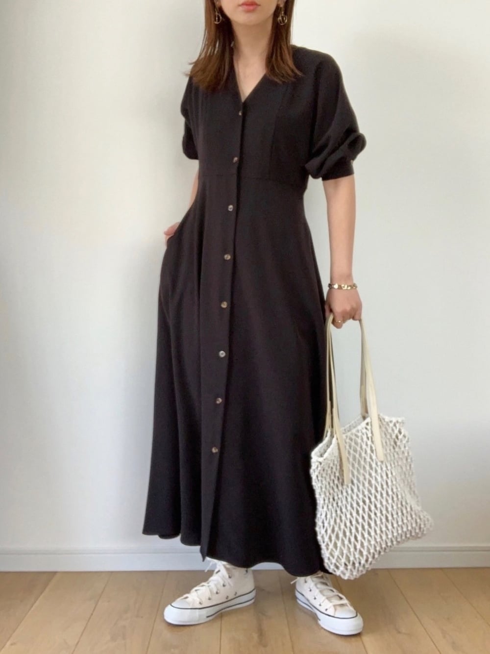 ブラックのロングワンピースを カジュアルに着ました☺︎ converseのハイカットを ワンピースに合わせるのが好きです。 コラボワンピースはご好評頂きまして 在庫分が完売となりまして、 現在は追加で予約販売が開始されて います☺︎ 見て下さりありがとうございます。