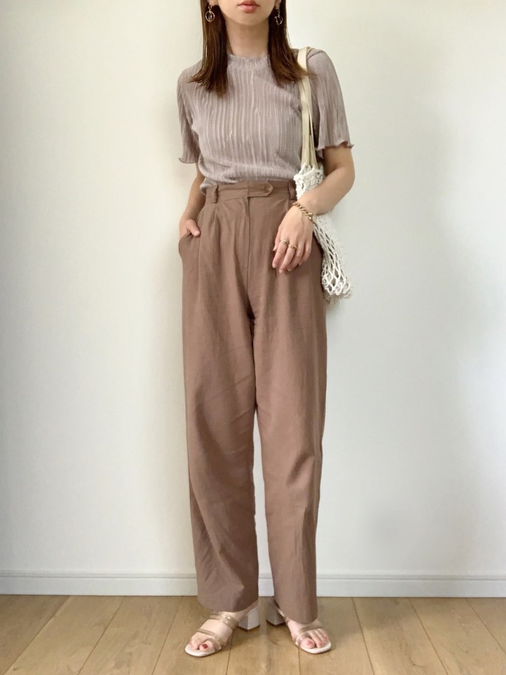 このパンツ履きやすくて すごくお気に入りです☺︎ もやっとした色でまとめたコーデ。 クリアサンダルで抜け感を 出しました。 見て下さりありがとうございます。