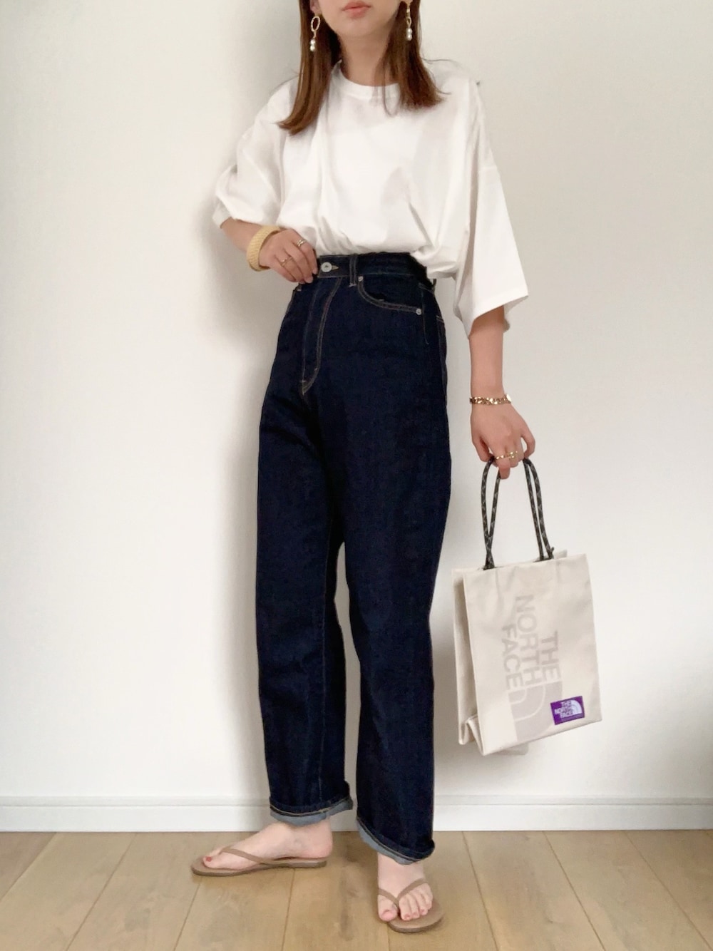 apres jour mignon のビッグTシャツ がすごく形良いです☺︎ インしても出しても可愛いかったです。 袖も長めなのでロールアップしたり 色んな着こなしが楽しめそうです。 生地は薄めなので、ハイウエストデニム にインしても大丈夫でした。 暑くなったら このコーデばかりしそうです! 見て下さりありがとうございます☺︎