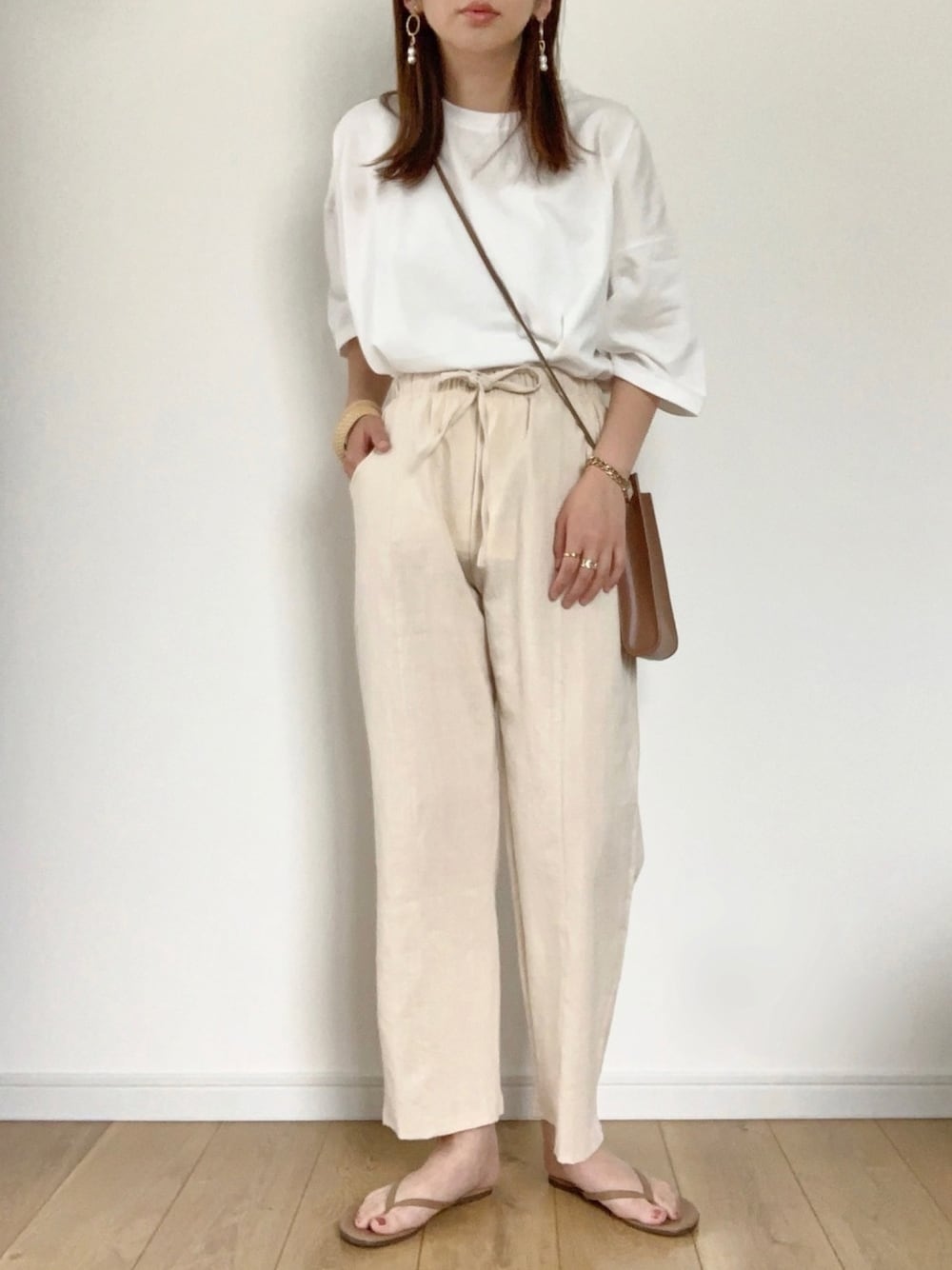 アイボリー×ベージュのコーデです。 小物はキャメルブラウンで 柔めにしました。 ラクチンなのでおうちコーデにも オススメです☺︎ 見て下さりありがとうございます。