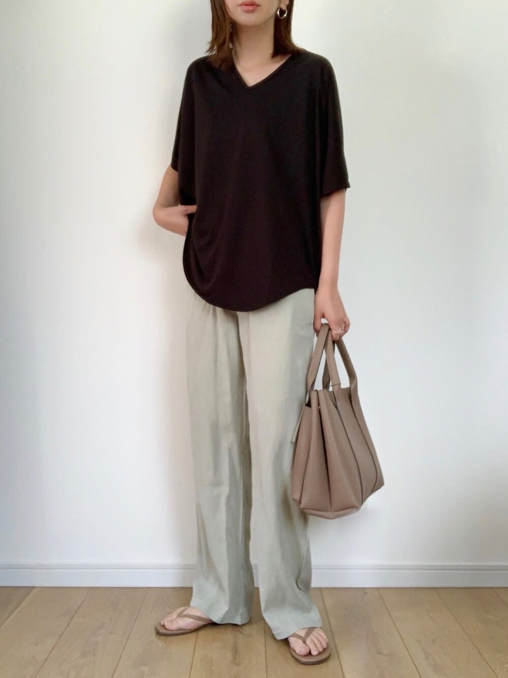 とろみのある素材と ゆったりした着心地が 病みつきになりそうな サロンアダムエロペのTシャツ☺︎ 空きが深くないさりげないVネックも 嬉しいです。 環境にも優しいサスティナブルなアイテム だそうです。 イージーパンツとリラックスした スタイルにしました。 見て下さりありがとうございます。