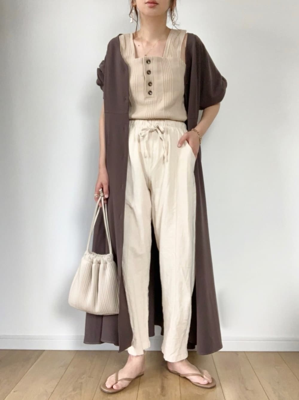 ブラウンぽいチャコールの色味が 可愛いワンピースを羽織りにした コーデです☺︎ 他はベージュのワントーンでまとめて 重たく見えないようにしました。 ちょっと肌寒い日は重ね着を楽しみに しています。 見て下さりありがとうございます。
