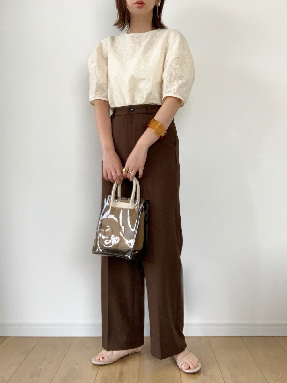 花柄の可愛いレースブラウスに ブラウンのパンツを合わせました☺︎ 小物は夏っぽくしました。 見て下さりありがとうございます。