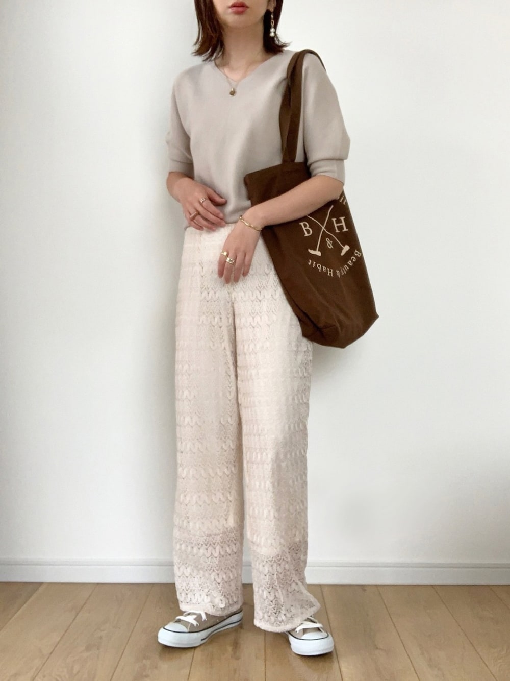 UNIQLOのサマーニットに レースパンツを合わせました☺︎ ブラウンのトートバッグがポイントです。 秋に向けてトップスは 濃いめの色が多くなりそうなので、 レースパンツはアイボリーにしました! 今日はZOZOTOWNでクーポンが 出ていました。 UNIQLOのニットはさらっとしていて 着やすいです。 生地が薄いのでインしやすいです。 見て下さりありがとうございます。