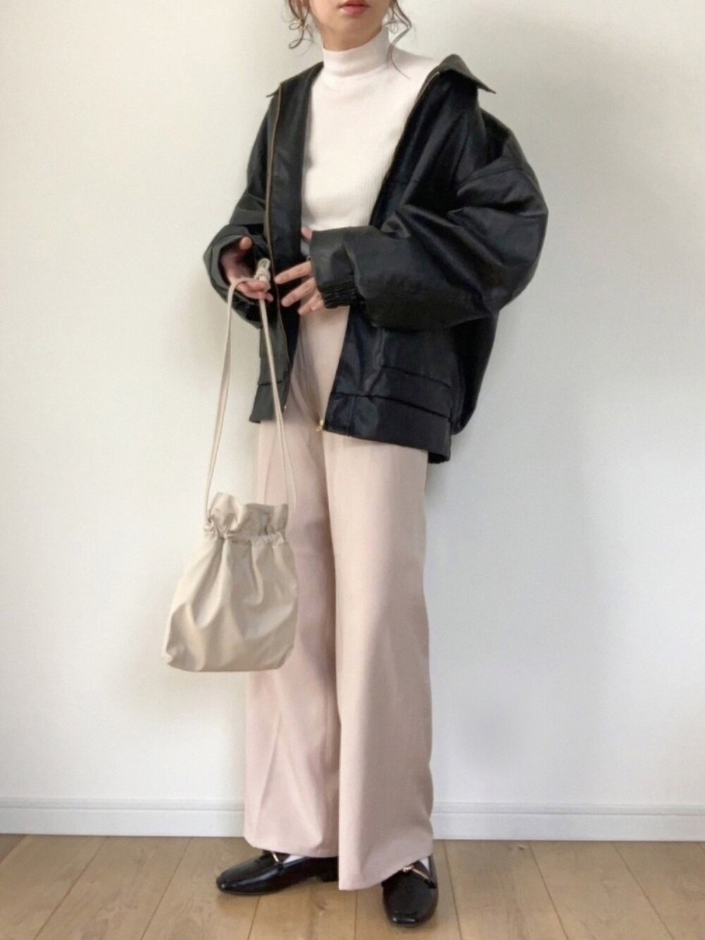 apres jour mignonのポケットブルゾンの コーデです☺︎ オーバーサイズのシルエットが ライダースよりカジュアルで可愛いです。 中にも着込めるので、 今から春まで活躍しそうです。 ブラックチョコ×ホワイトチョコ🍫 #チョコ色に染まれ ご覧下さりありがとうございます。