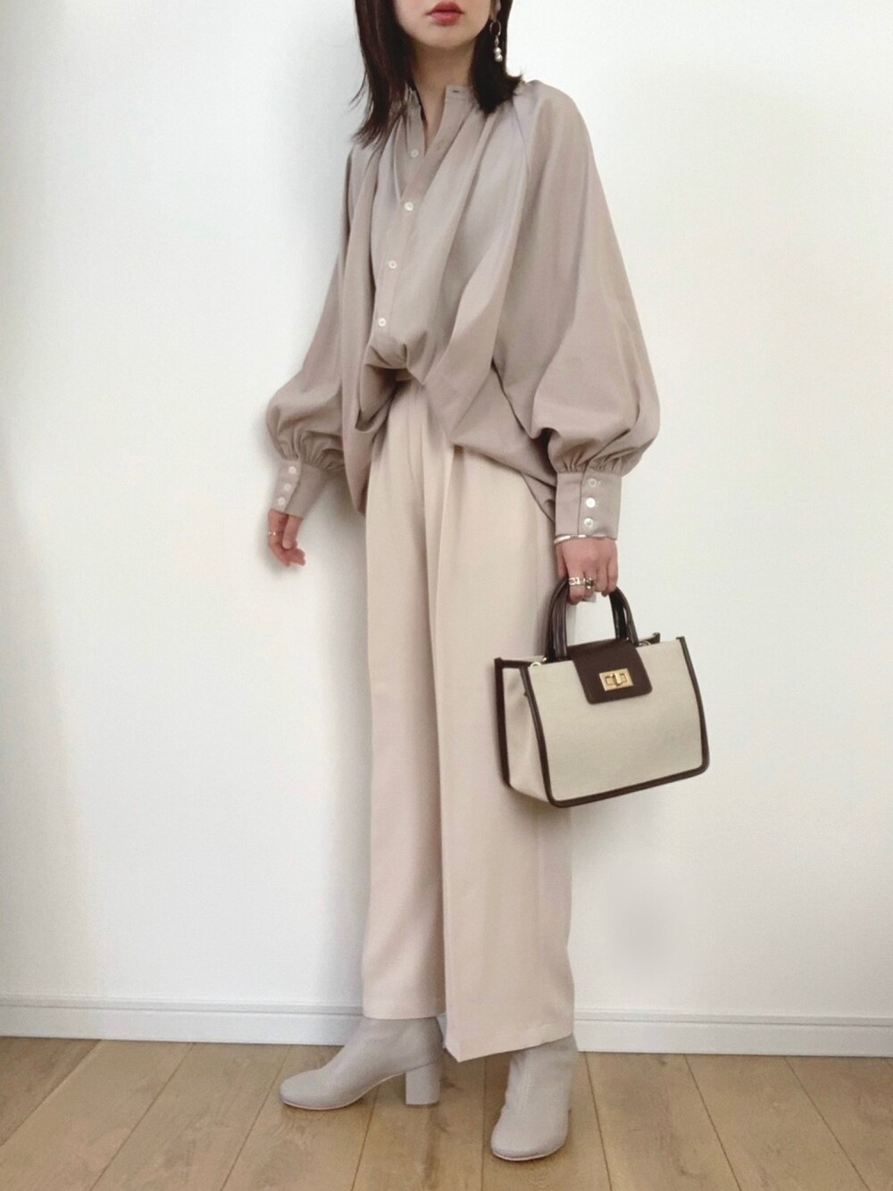ベージュ×アイボリーの ワントーンコーデです☺︎ カーディガンやトレンチの下に着れそうな 組み合わせにしました。 ご覧下さりありがとうございます。