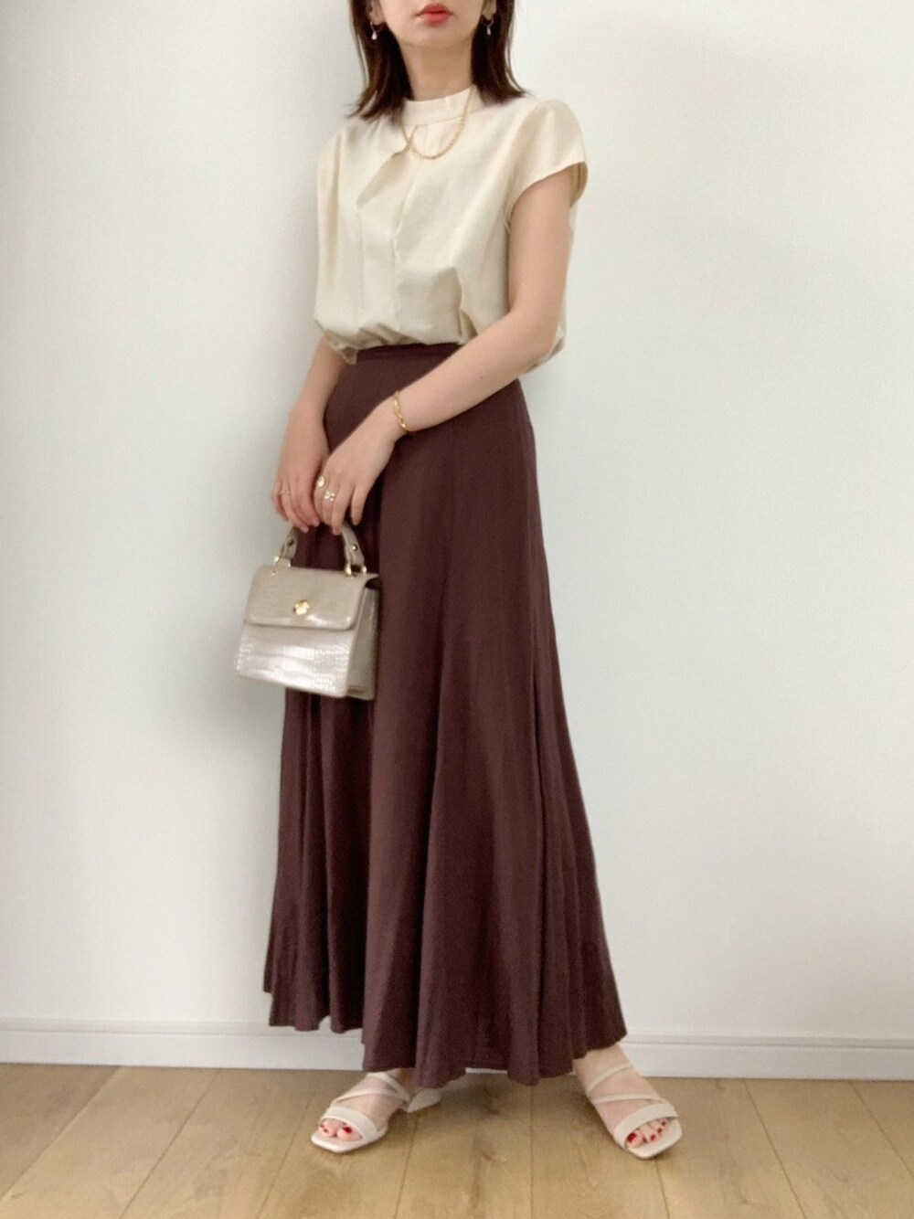 リネンブラウスにリネンスカートを 合わせた夏コーデです☺︎ ライトベージュ×ブラウンは 好きな色の組み合わせです。 ブラウスはハイネックにタックの入った デザインが可愛いくてお気に入りです。 ご覧下さりありがとうございました☺︎