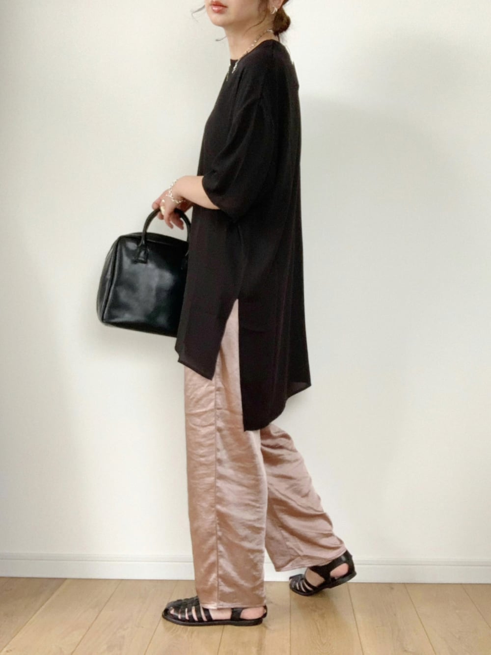 ハーフスリーブと着丈がちょうどいい 感じのシアートップス。 サテンパンツでゆるてろコーデです☺︎ お気に入りの組み合わせです。 ご覧下さりありがとうございました。