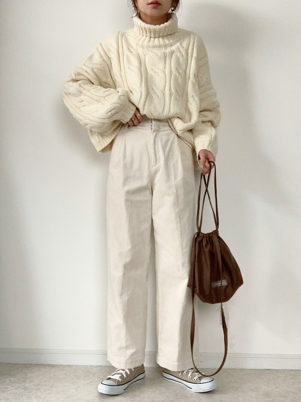 ケーブルニットとコーデュロイパンツの ホワイトコーデです☺︎ 洋服がボリュームがあるので スニーカーはコンバースにしました。 ご覧下さりありがとうございました。