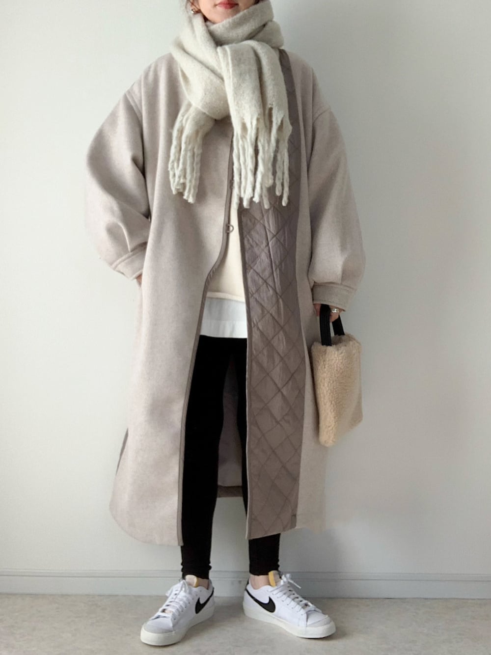 maiko のノーカラーコート「アシメキルティング配色コート」を使ったコーディネート