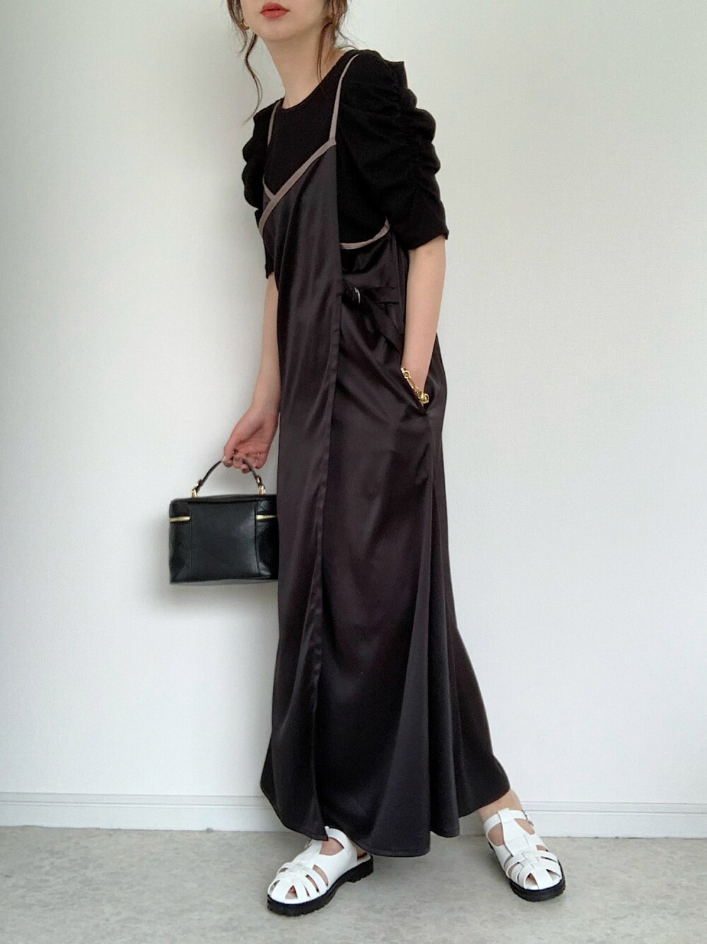 キャミワンピのブラックコーデです☺︎ ホワイトのグルカサンダルを ポイントにしてみました。 ワンピースは前後2wayで着られます。 ご覧下さりありがとうございました。
