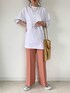 カラーパンツとTシャツの シンプルコーデです☺︎ 2枚目は白Tシャツの インしないコーデです。 腰張り体型の私がきれいに履けるパンツは なかなかないので、 かなり細かくお願いをして リエディさんに作って頂きました🥲✨ 夏素材で履けるのも最高です。 ご覧下さりありがとうございました。