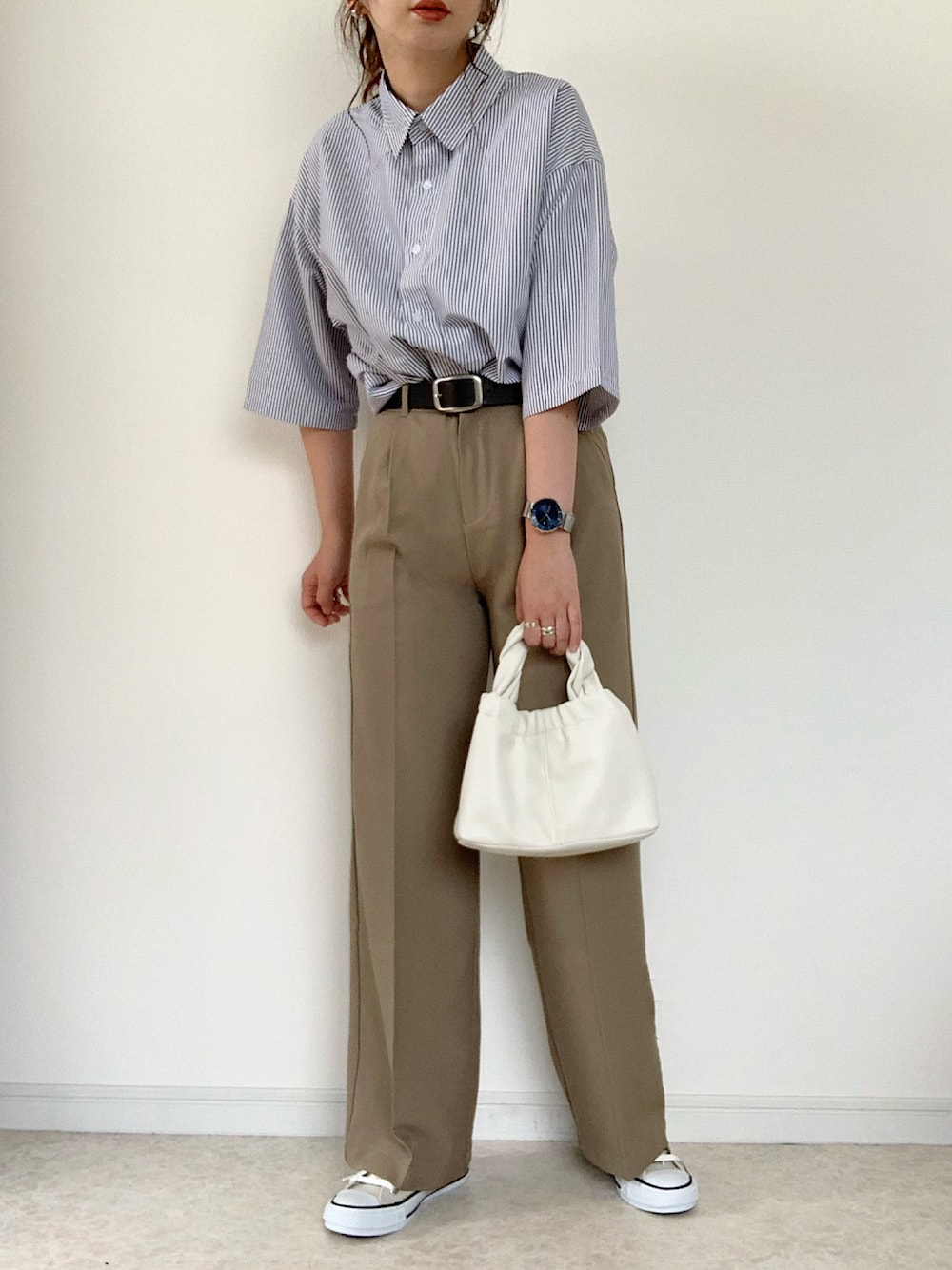 ストライプシャツ×スラックスの きれいめなメンズライクコーデ。 ベルトでウエストマークしました。 薄いグレーのコンバースも 最近のお気に入りです👟 2枚目以降はシャツの着まわしコーデです ご覧下さりありがとうございました☺︎