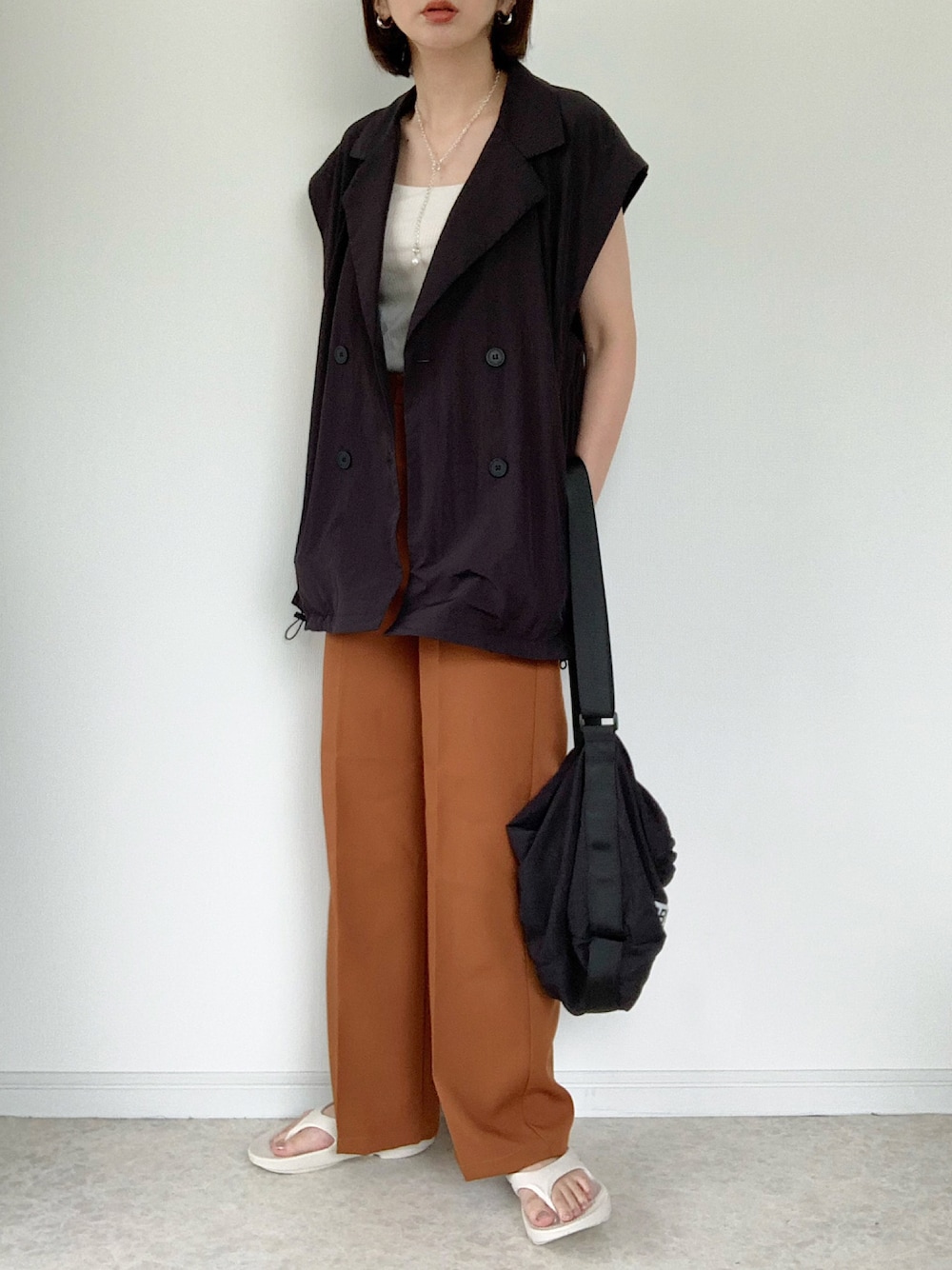 トレンドのジレコーデです。 テーラードなので大人見えします✨ スラックスと渋めカラーで晩夏っぽく してみました。 ご覧下さりありがとうございました。