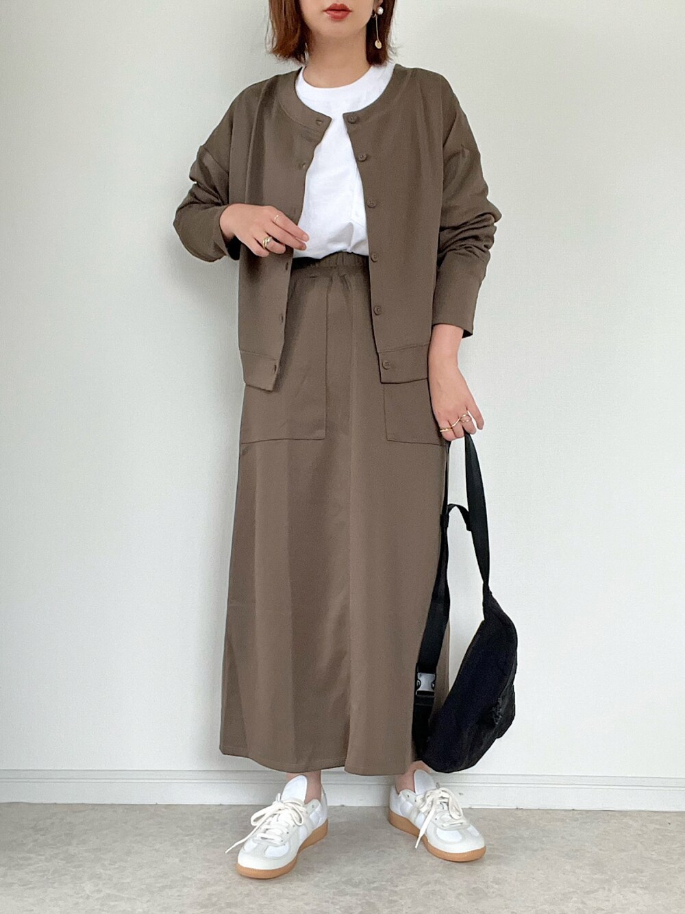 セットアップで着られる プチプラなカーディガンとスカートで ブラウンコーデ。 さらっとした伸びの良いカットソーの生地で 着心地がとても良いです◎ ご覧頂きありがとうございました。