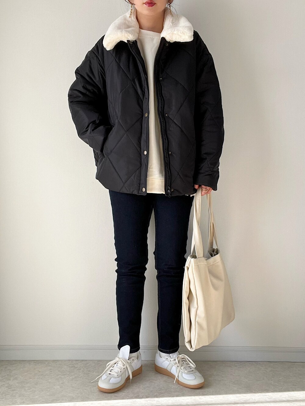 ファーの取り外しができる キルティングジャケットは 可愛くて2色めです☺︎ スウェットとスキニーデニムで カジュアルコーデにしました。 ご覧くださりありがとうございました。