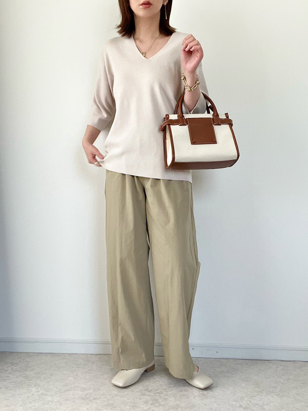 春のシンプルニットコーデです。 1枚あると便利なVネックニットは くすみカラーが大人っぽくて好きです。 ご覧くださりありがとうございました。