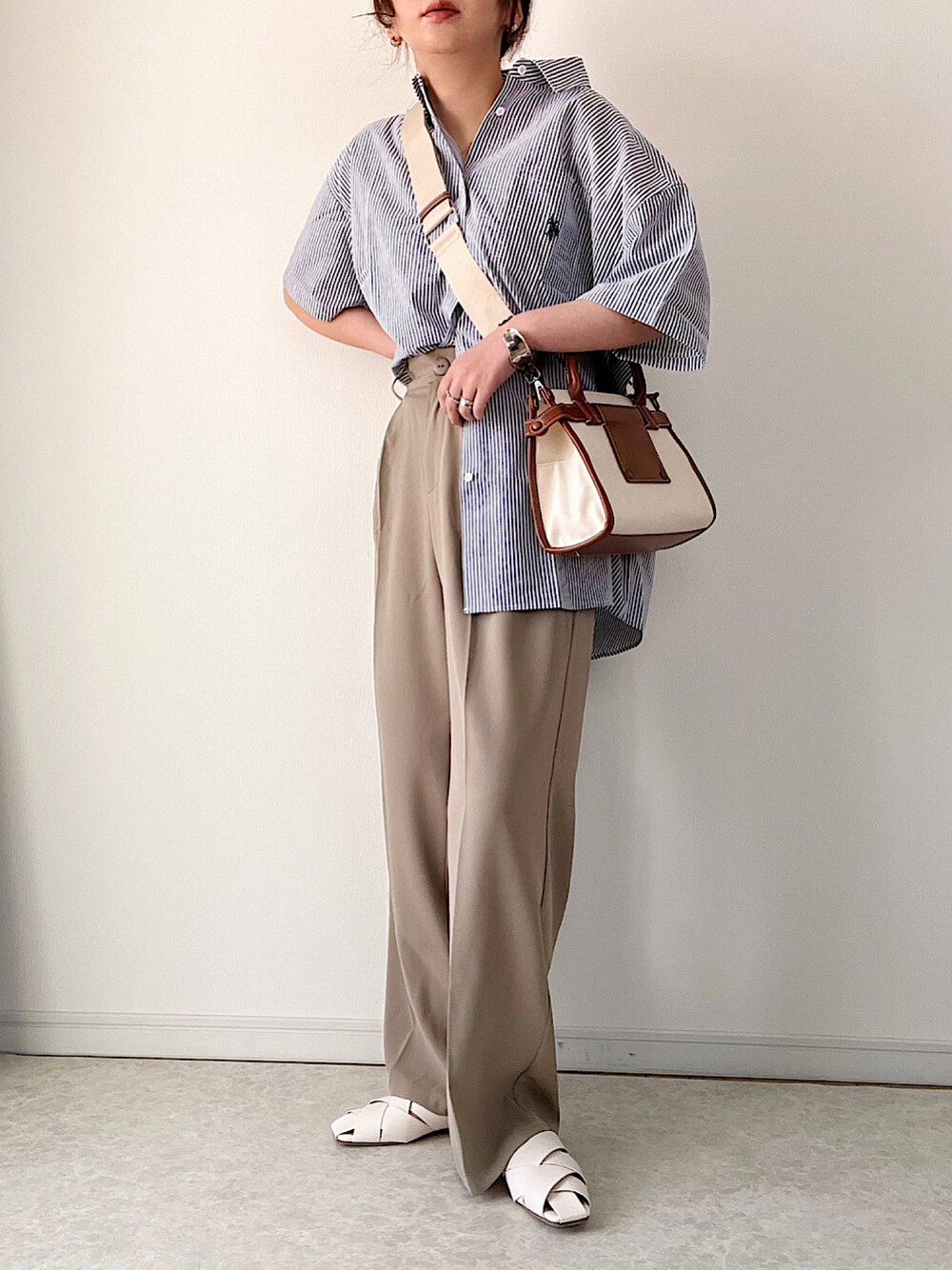 ストライプシャツにキャンバストートで きれいめなメンズライクのイメージです。 ストライプシャツは長袖も半袖も 大好きです👔 ご覧くださりありがとうございました。