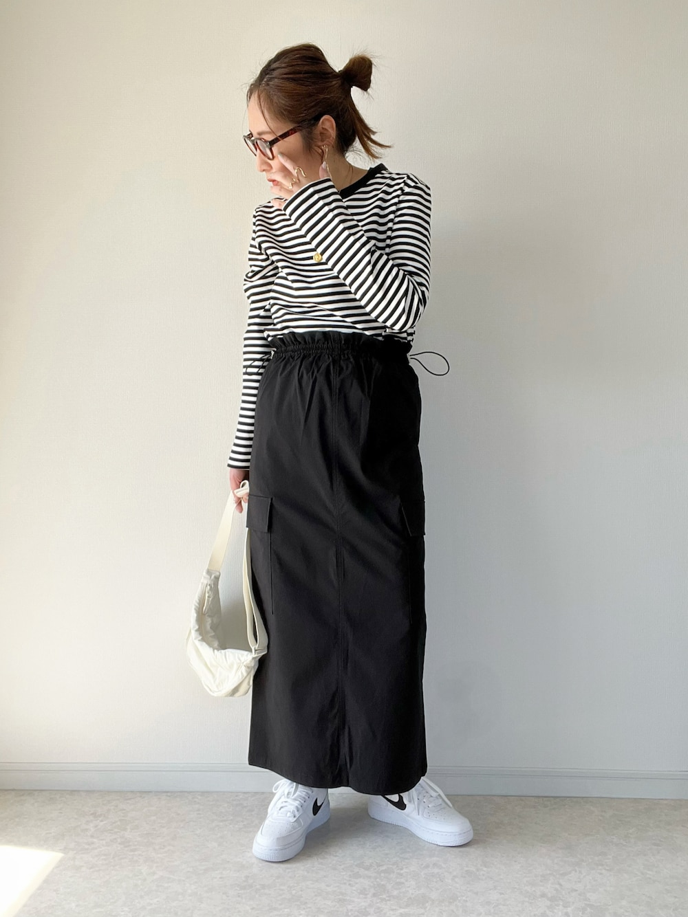 パシオスさんとコラボ企画で 作っていただいた人気のカーゴスカート♡ ¥2,189とプチプラですが めちゃくちゃ可愛く仕上がっております。 ZARAのボーダーTシャツと シンプルなモノトーンコーデに。 2枚目以降はボーダーTシャツの 着まわしコーデになります。 パシオスさんコラボ企画はInstagramの プロフィールからもご覧いただけます。 是非ご覧いただけたら嬉しいです♡ バッグはUNIQLOの ラウンドショルダーバッグです。 ご覧いただきありがとうございました。