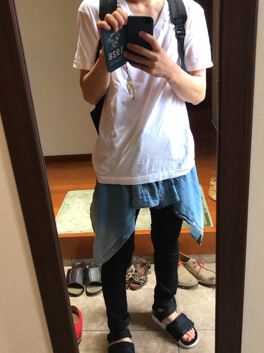 夏っぽく腰巻スタイルで。 シャツはアイロン忘れてシワが目立ちますね… ネックレスもつけ忘れました…