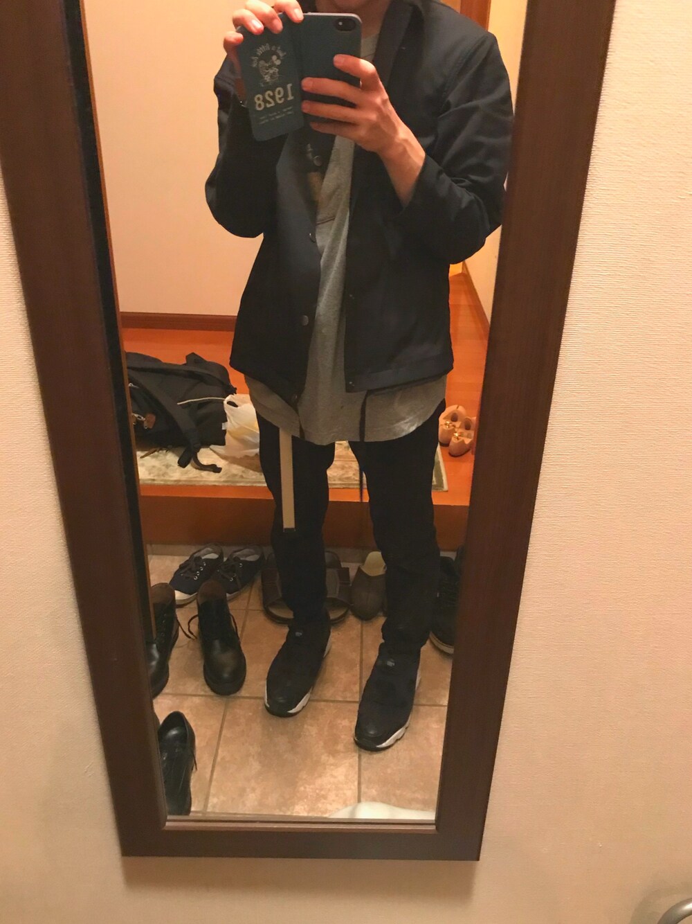 コーチジャケット丈短めなんでビッグシルエットでいいレイヤードになりますね! ガチャベルトとコーチジャケットの垂れてる紐が三本なのがポイントです!