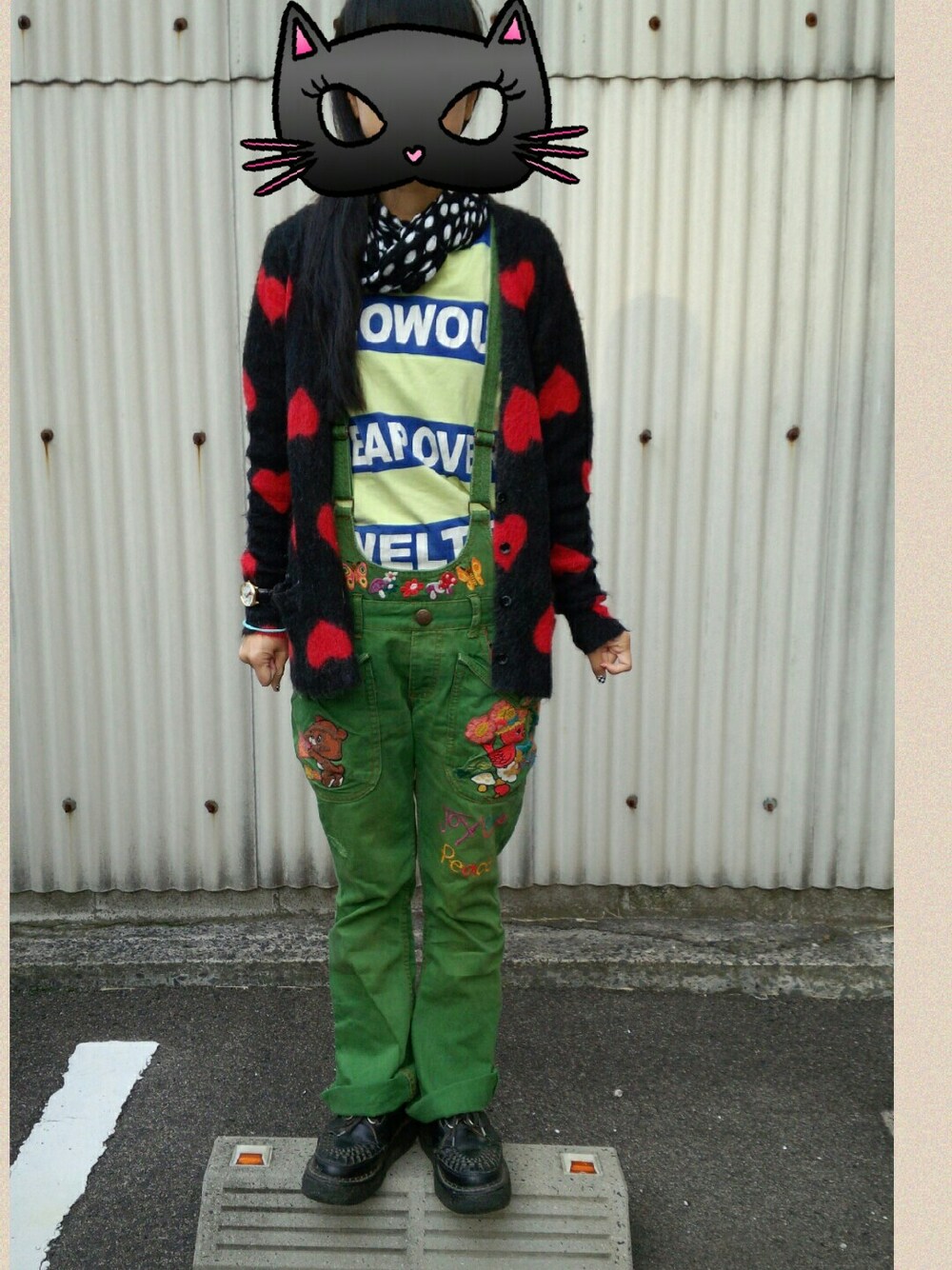 子供とお揃いのグラのつなぎ。 グリーンが好きでよく買っていた頃のやつです。 RNAのカーデは薄手でも暖かくて優秀です。