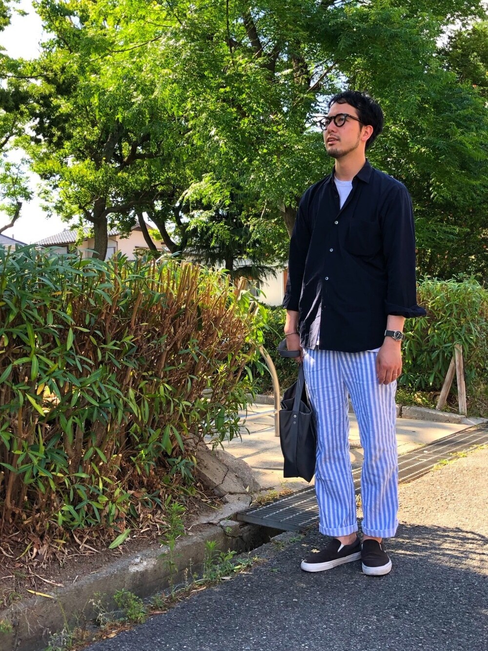 グリーンダヨ。 緑がいっぱいの公園は素敵。 昔、余裕のあったパンツが窮屈になってきている現実。 ネイビーのシャツにブルーストライプパンツが、涼しくて良い。4年くらいきてるけどCOMOLIのシャツはなんやかんやええですね。