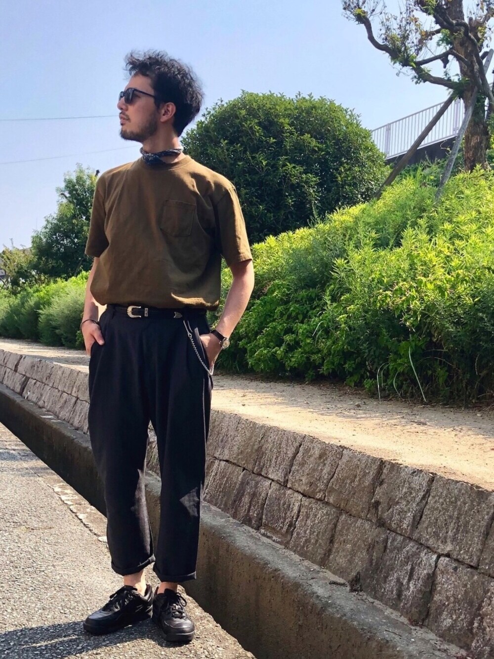 猛暑日だから、お洒落を楽しもう。 と、たまにのTシャツをタックインスタイル。ネッカチーフを添えて。 エロさ抜群のイグアナベルトをアクセントにあえてのスニーカー。(本当は色合わせ)そして、mandoの名作パンツの万能性を改めて感じました。