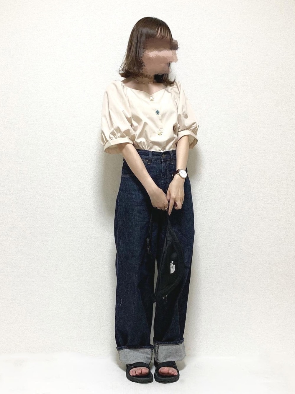 ukiのシャツ/ブラウス「袖ボリュームイロイロ釦スクエアネックブラウス」を使ったコーディネート