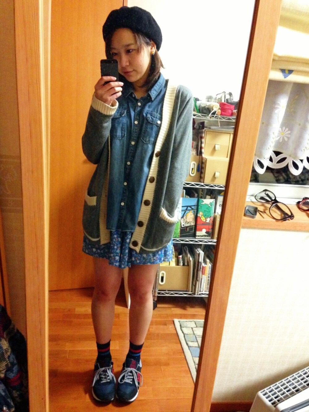 シャツ: PAR ICI カーディガン: CUBE SUGAR 花柄パンツ: PAR ICI ベレー帽: ノーブランド スカートっぽいけど違うんですー♪