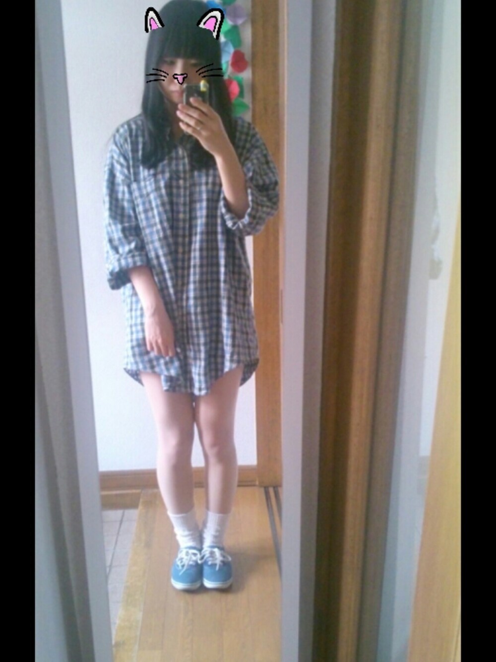 オーバーサイズのシャツをワンピがわりに◎袖が長すぎだったので切って、まくってます(´▽`) シャツ*古着 中に履いてるショーパン*ZARA 靴下*頂き物