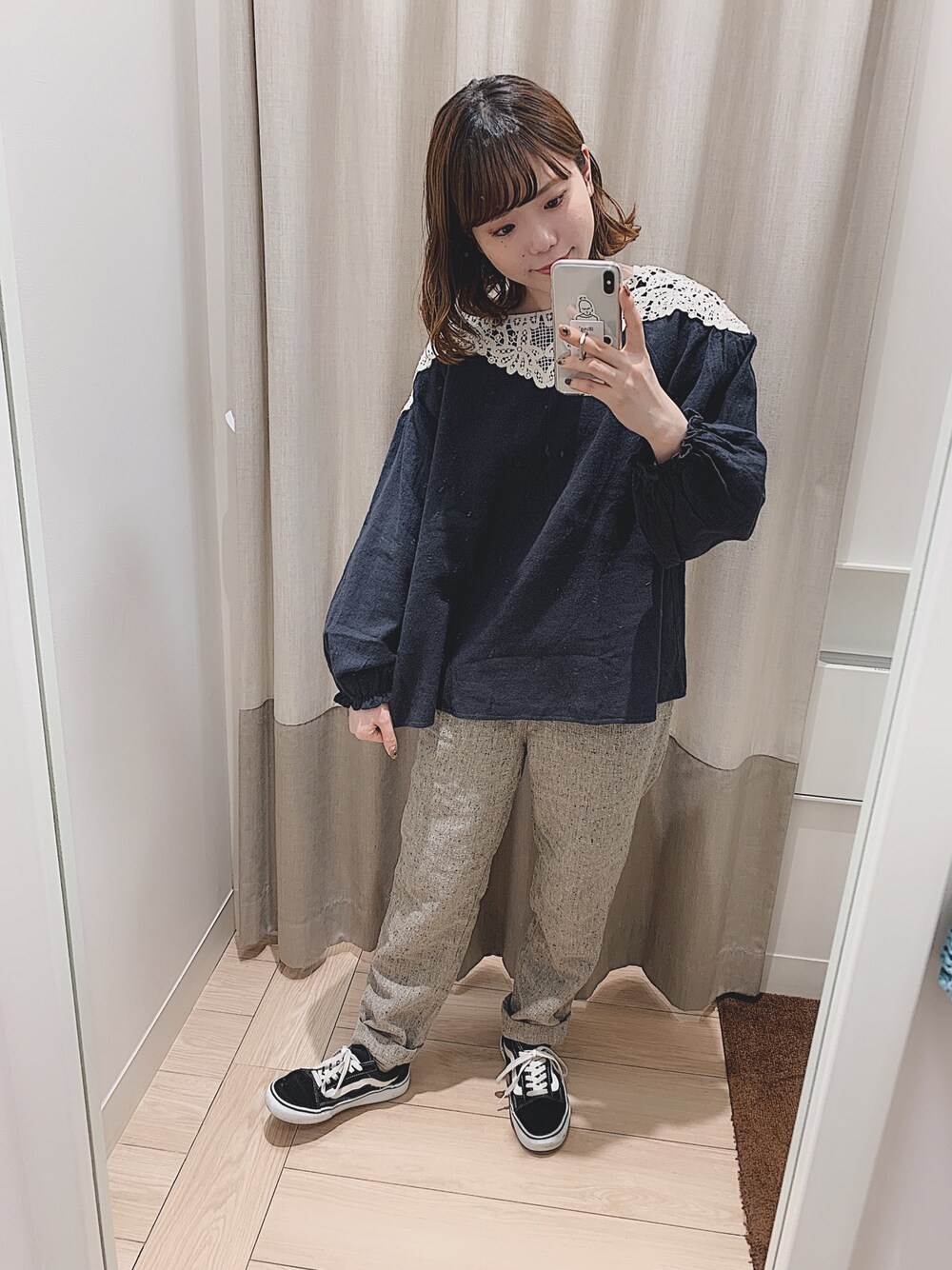 ナチュラルなレース付きのブラウスはフワッとした形なので、スッキリとしたパンツとの合わせがgood◎ パンツはロールアップしてます!