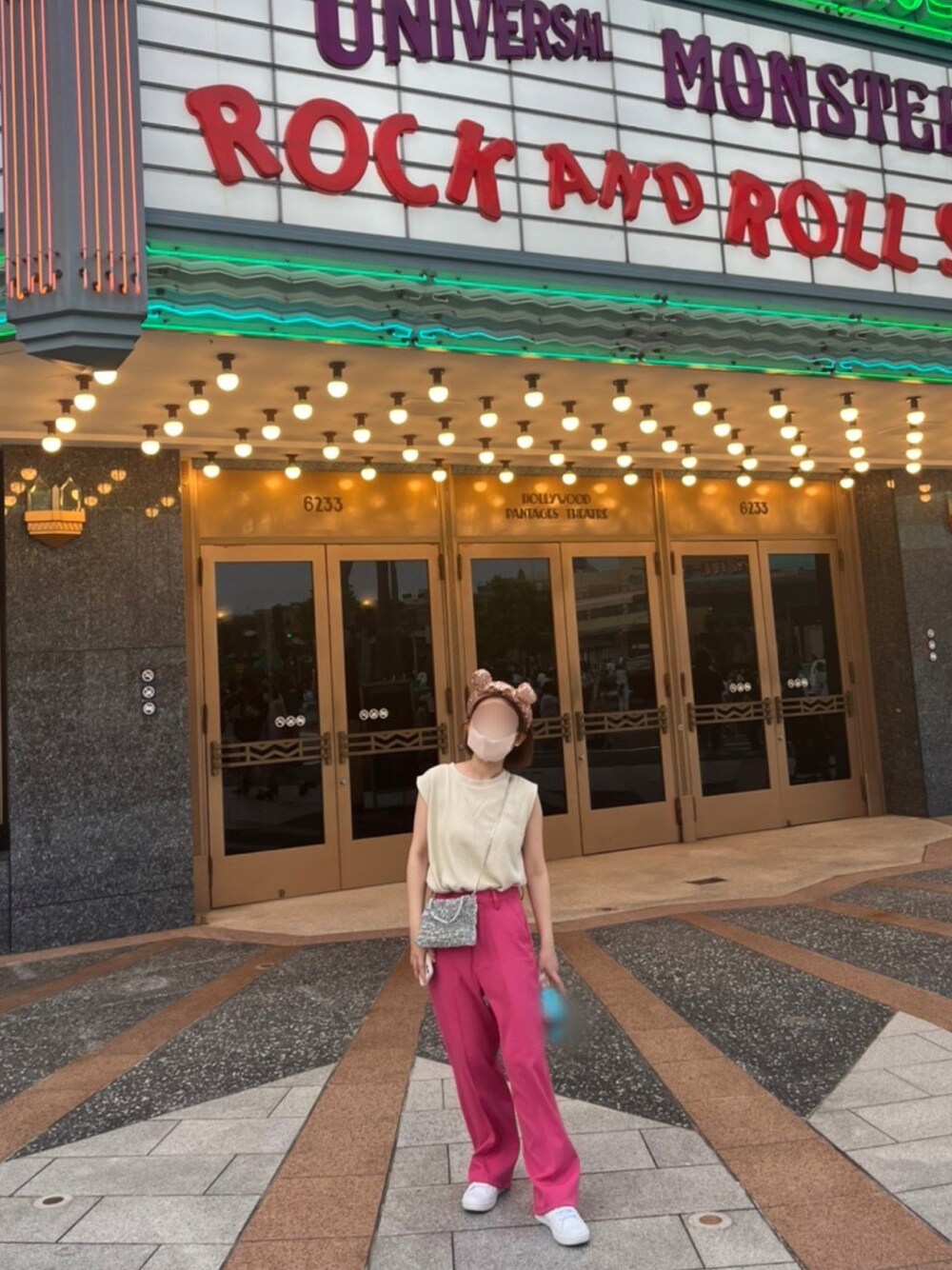 この前ユニバに行った時のコーデ🎢 パンツとカチューシャをピンクで合わせた💗 カチューシャもバッグもキラキラ✨