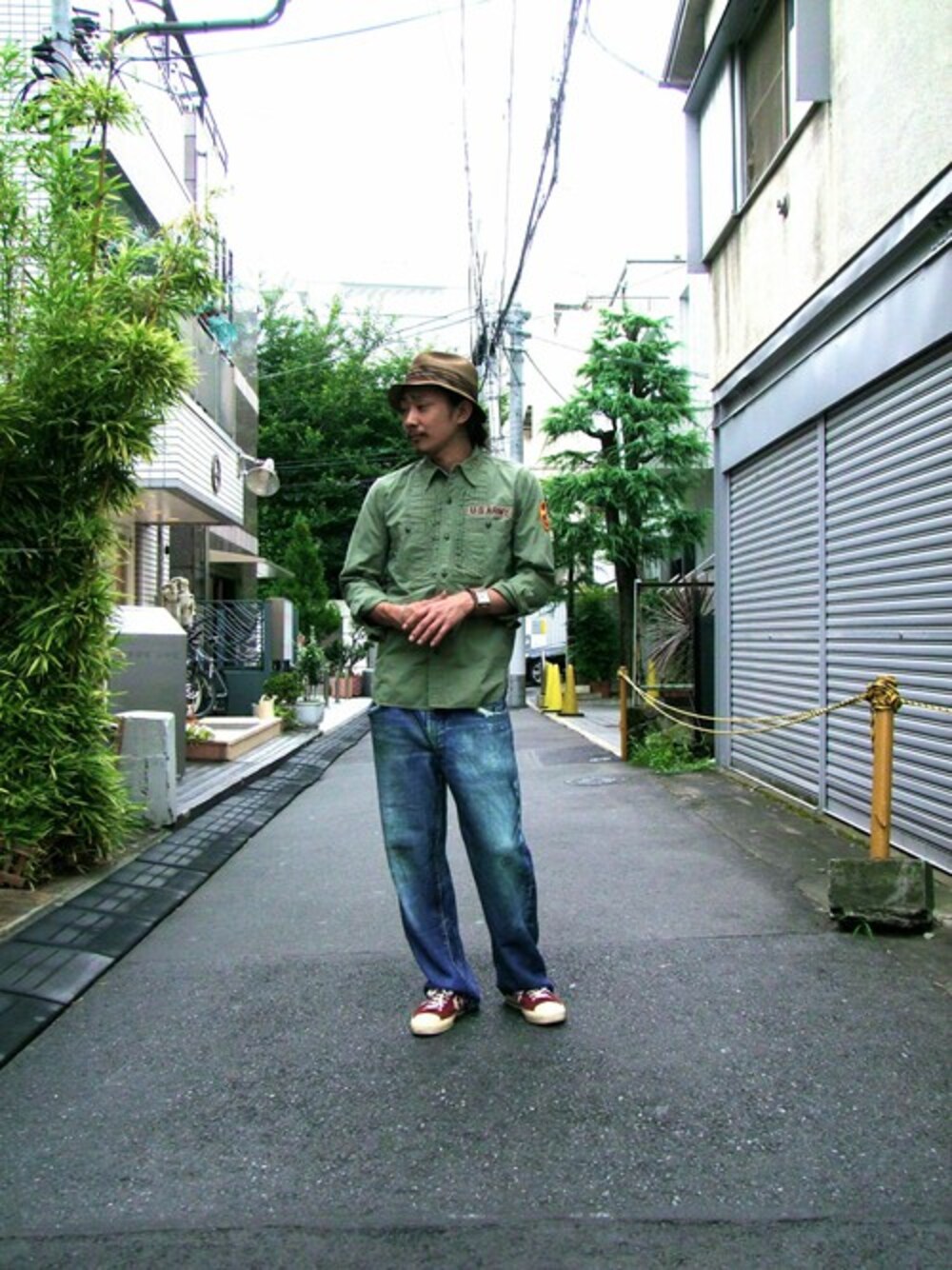 男臭いスタイリングにハットやスニーカーの小物でハズしました。
