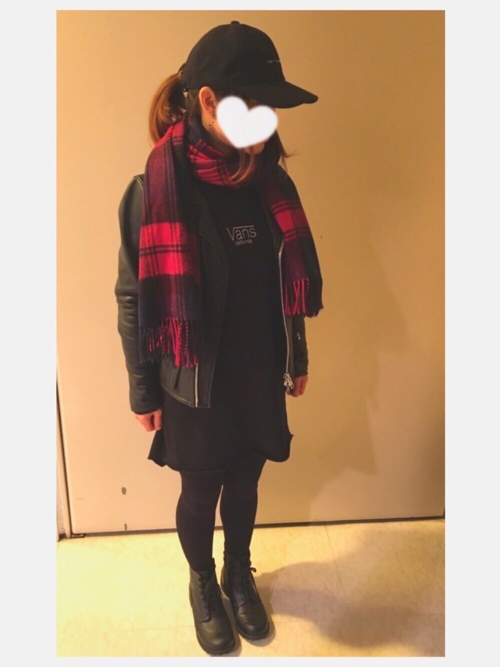 いいね、セーブありがとうございます(*^◯^*) 今日は全身黒でまとめました( ^ω^ ) さし色に赤チェックのマフラーをしました❤️ エックスガールのライダース、かっこいいです。