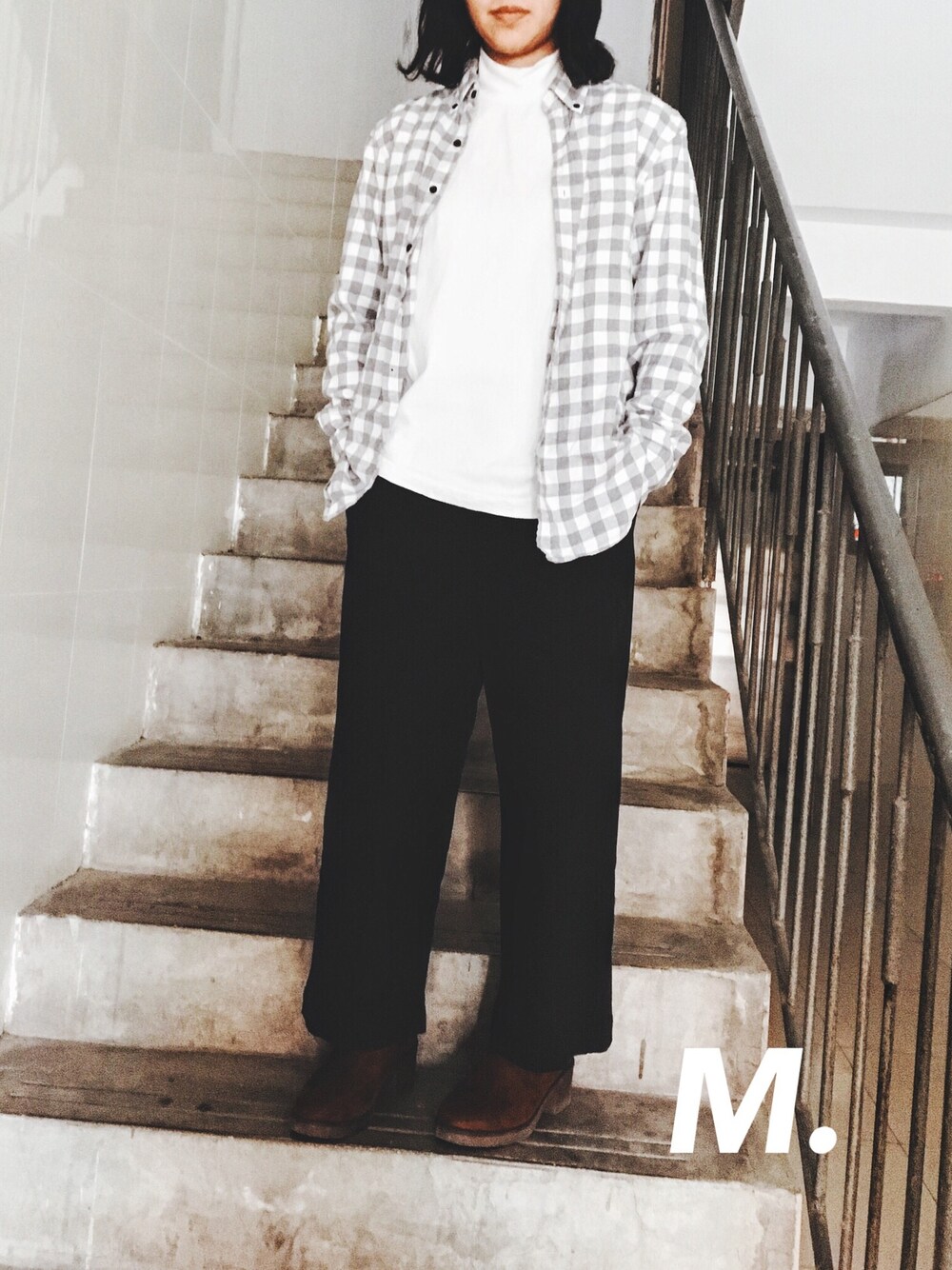写真が少し見えずらいですが。 トップスは全部UNIQLOで全部メンズの物です。 靴は一昨年bershkaで買ったショートブーツです。😀😀 襟付き長袖=UNIQLO シャツ=UNIQLO ズボン=studio clip 靴=bershka