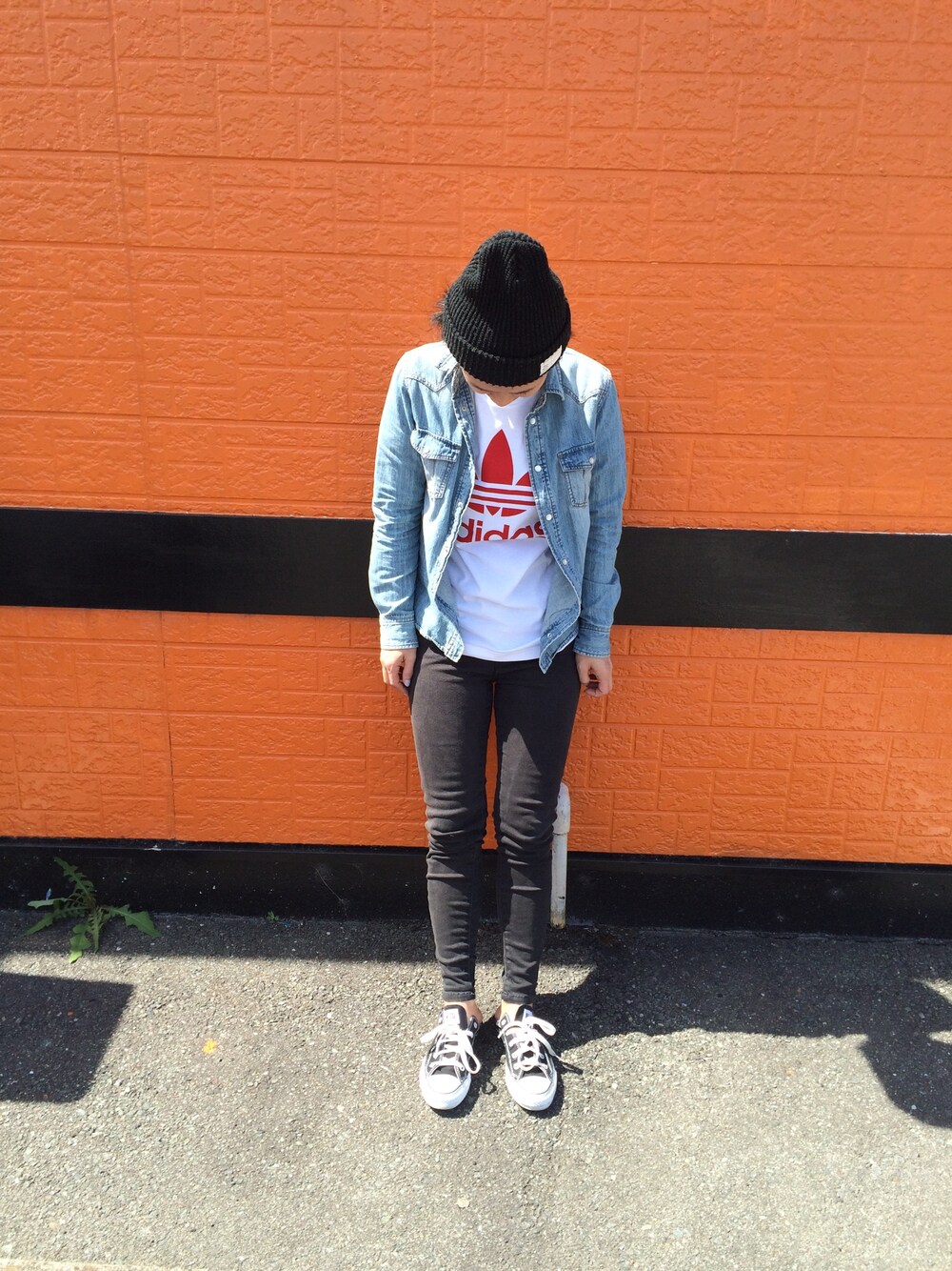 ラーメン屋の前で。笑 天気がいいからデニムシャツ でいい感じ。