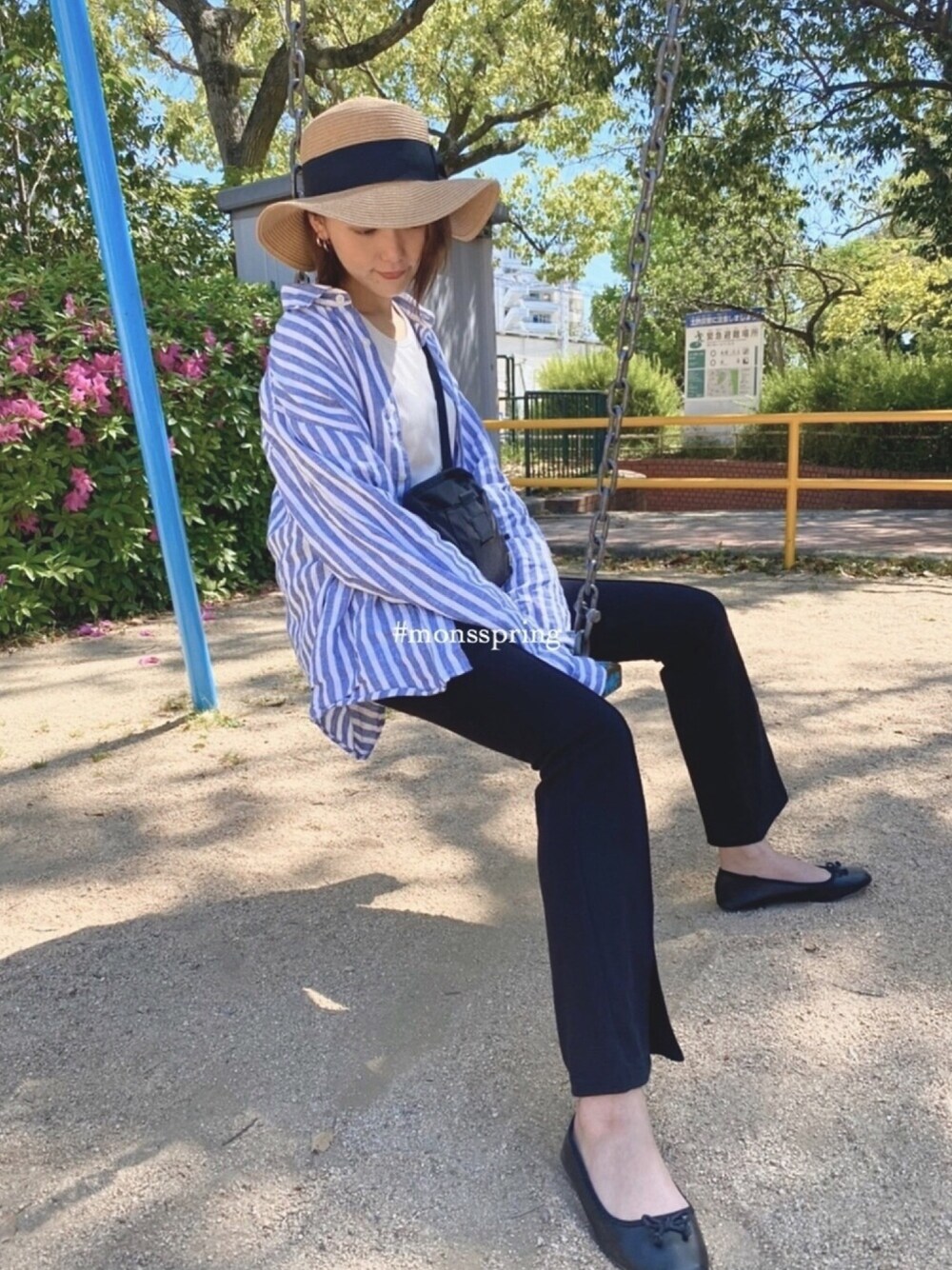 日差しが強い日のスーパーまでのお散歩コーデ 途中公園が貸し切り状態で久しぶりに ブランコぶらぶら👐 彼シャツがポイントです👾♡