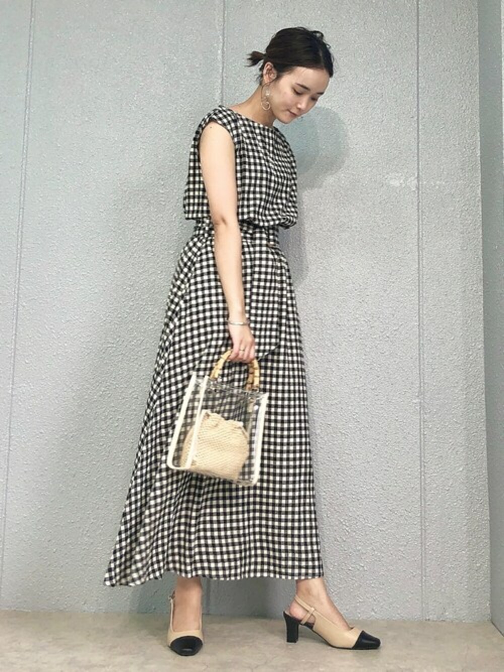 海に行きたいコーデ♡ コンビカラーパンプスとチェックの相性が◎ クリアバッグも小さすぎないので、 お出かけで使いやすくておすすめ。