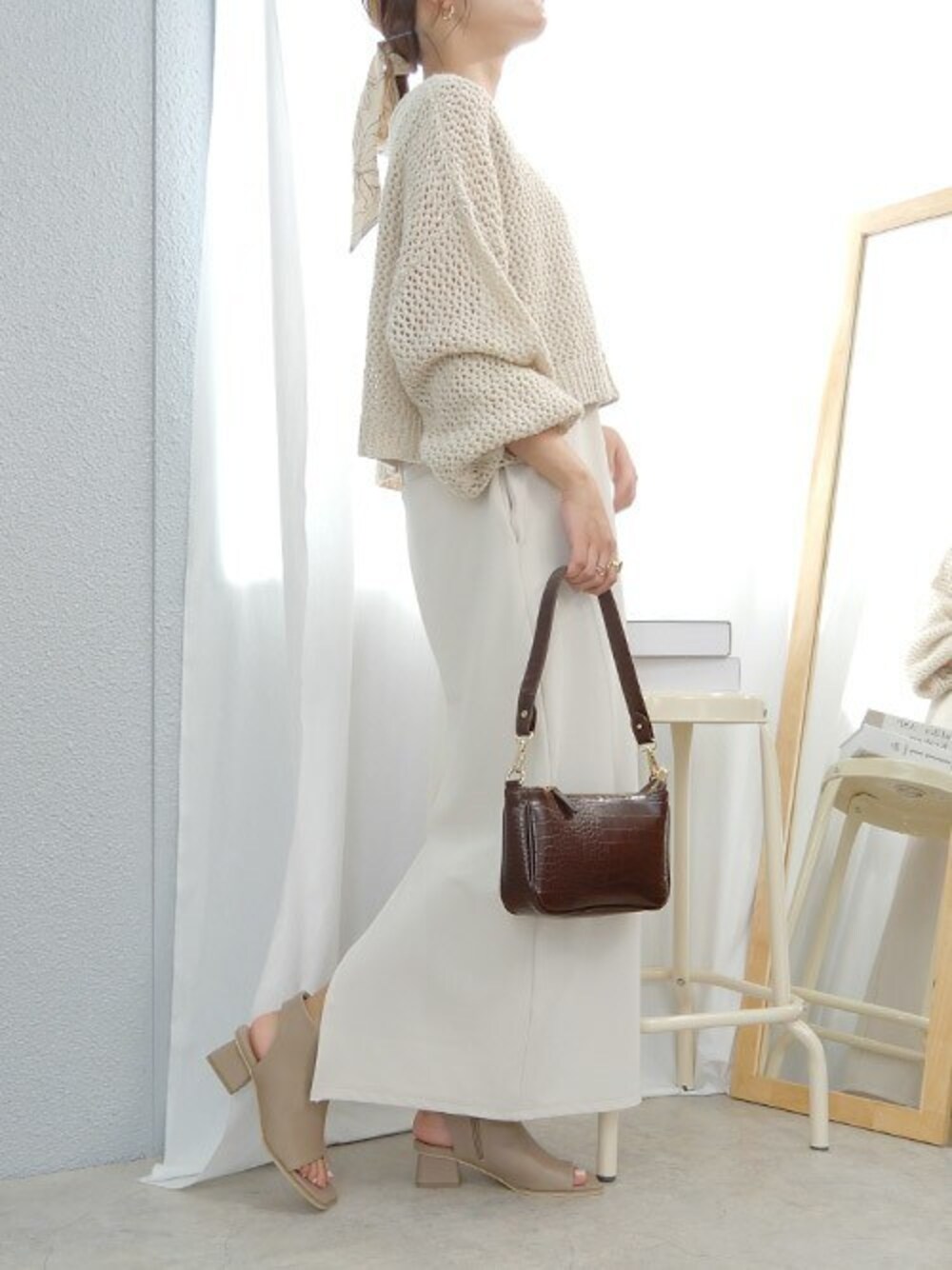 One tone code👜👢 ブーサンがあればさりげなく秋先取りコーデできるからめっちゃ良い◎ シンプルになりがちな淡色コーデには スカーフ巻きアレンジするだけで雰囲気変わるのでおすすめです🤍