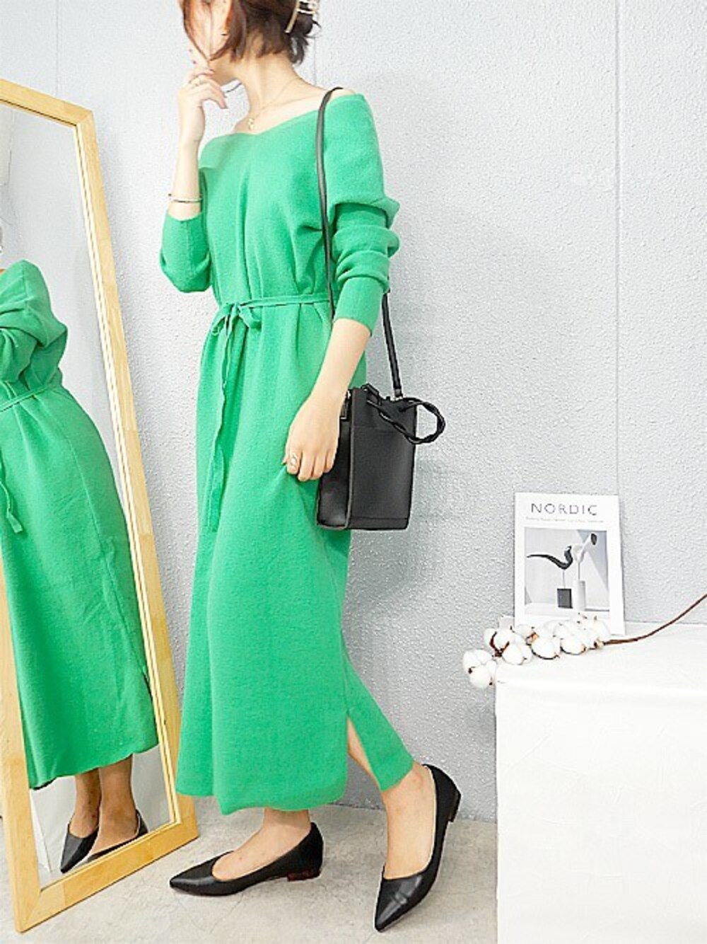 Green×Black🌿🖤 GRLのグリーンワンピが主役のコーデ 小物はブラックで締めて◎ パンプスのヒールにこっそりべっ甲柄が入ってるのが お気に入りポイント✌