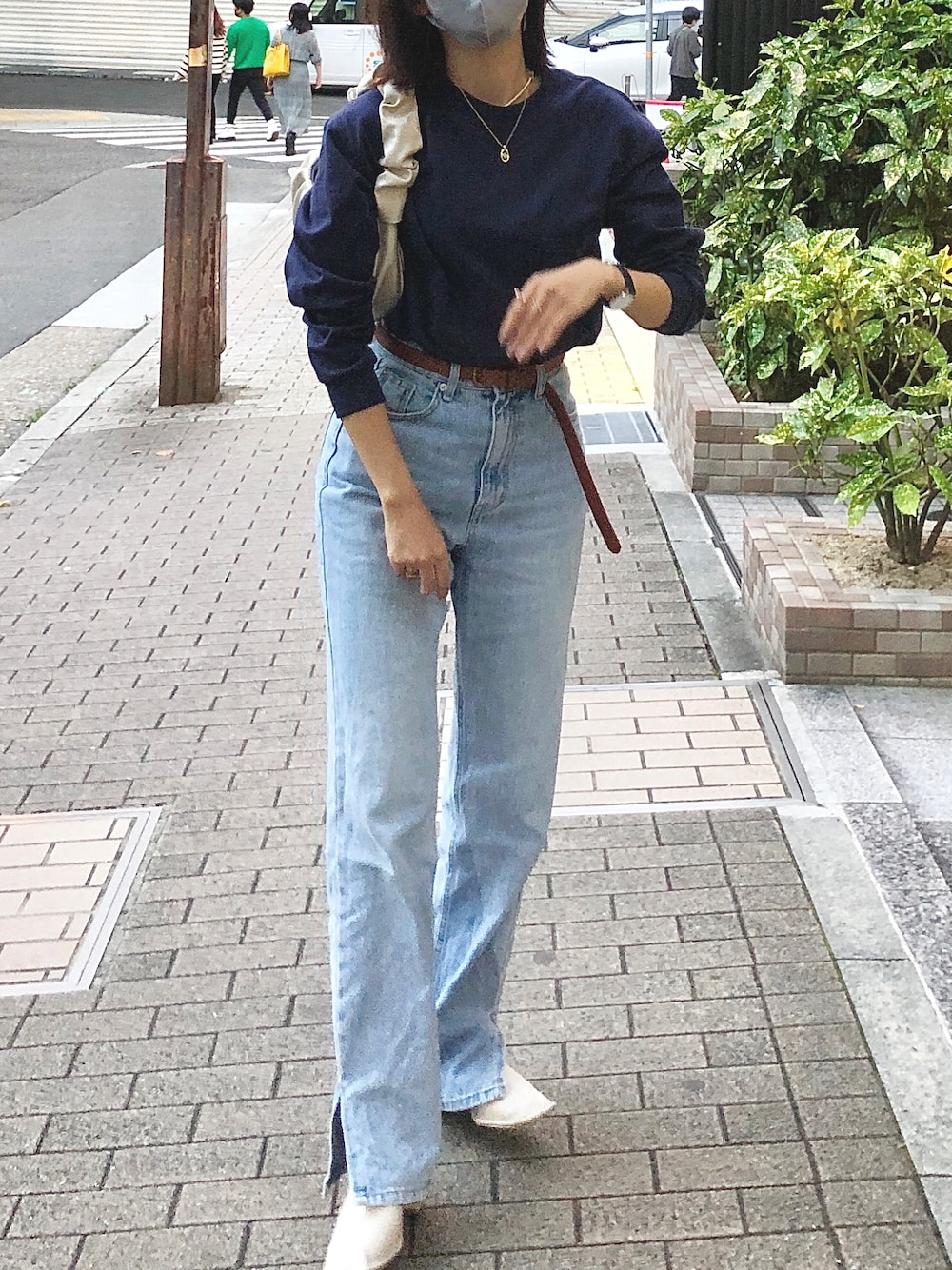 👖👢👜🤍 どカジュアルにきれいめ小物✌︎ UNIQLO UのメンズロンTの背中にタグ付けた♡