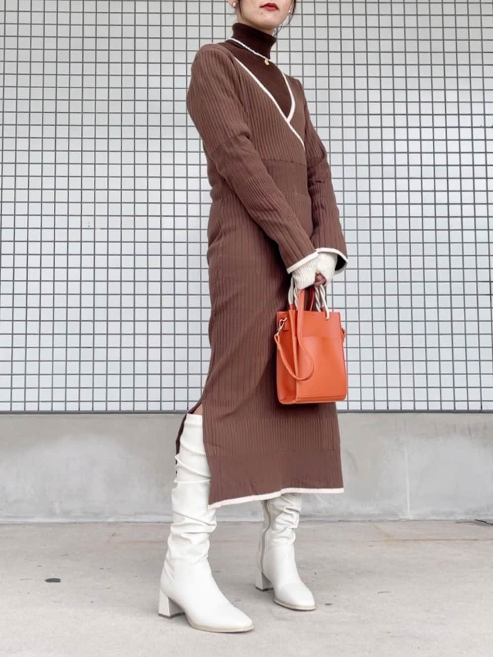 mayuのワンピース「カシュクールパイピングリブニットワンピース」を使ったコーディネート